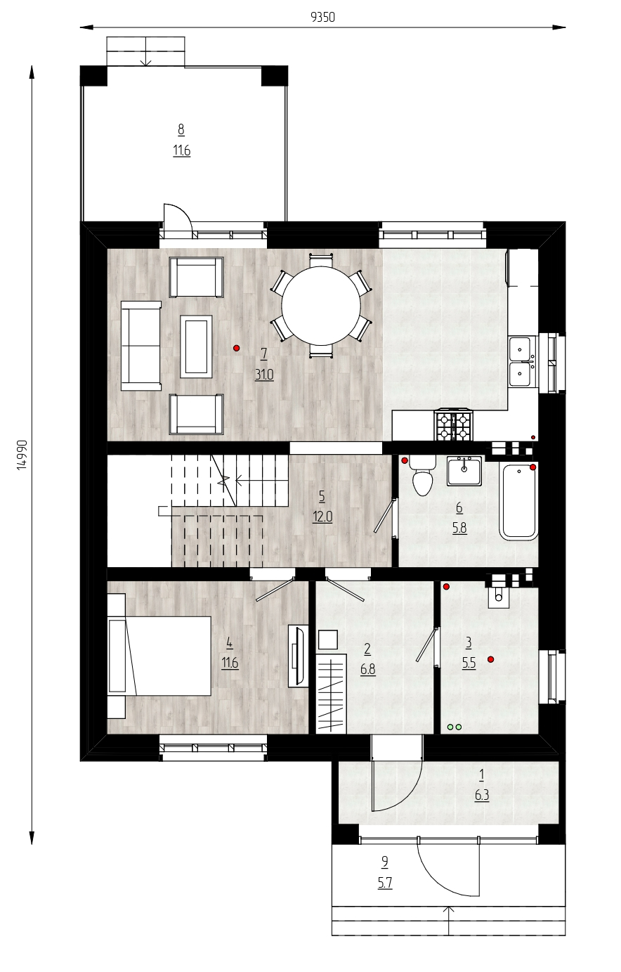 крышей, просторной гостиной с выходом на террасу, рассчитанный на 6-7 человек.