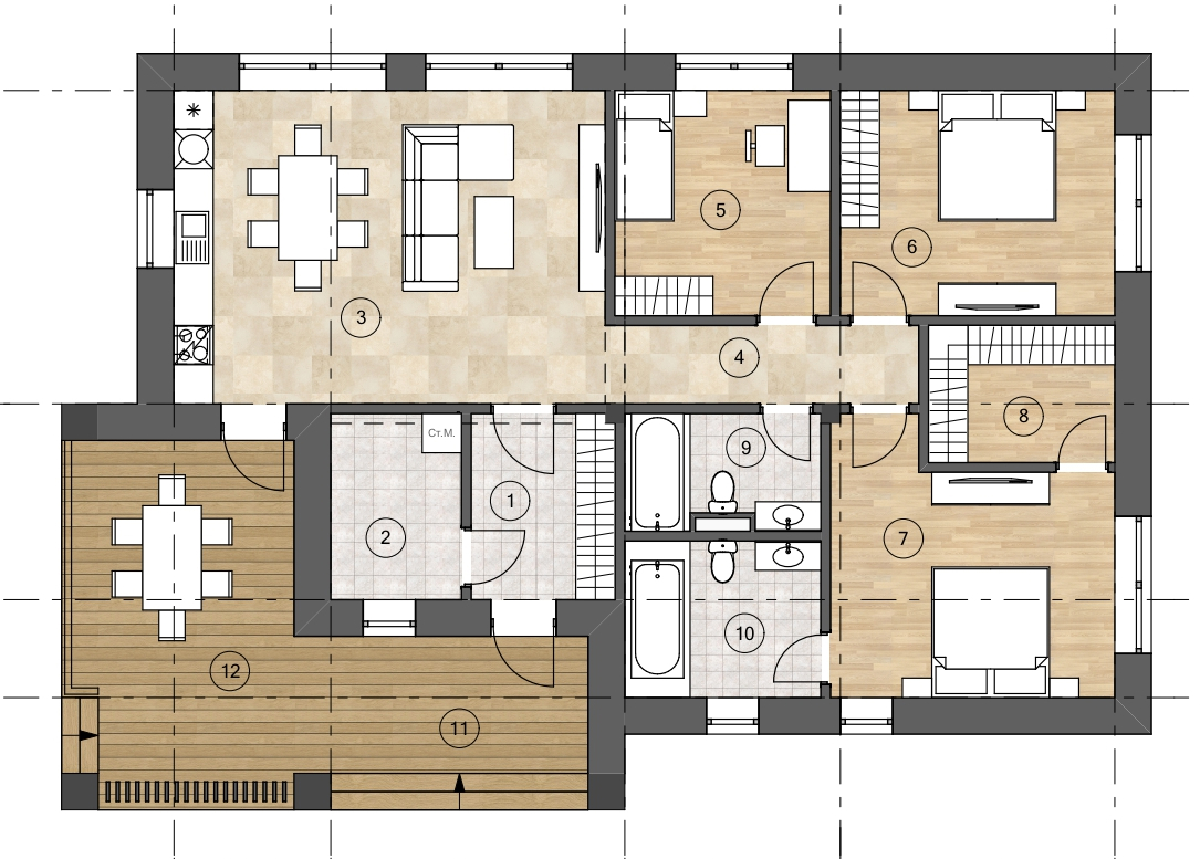 Проект HH110 дома выполнен в современном стиле. Эргономичный, продуманный индивидуальный проект дома с плоской кровлей, отвечающий всем современным требованиям и стандартам. Дом рассчитан на постоянное проживание 4-5 человек.